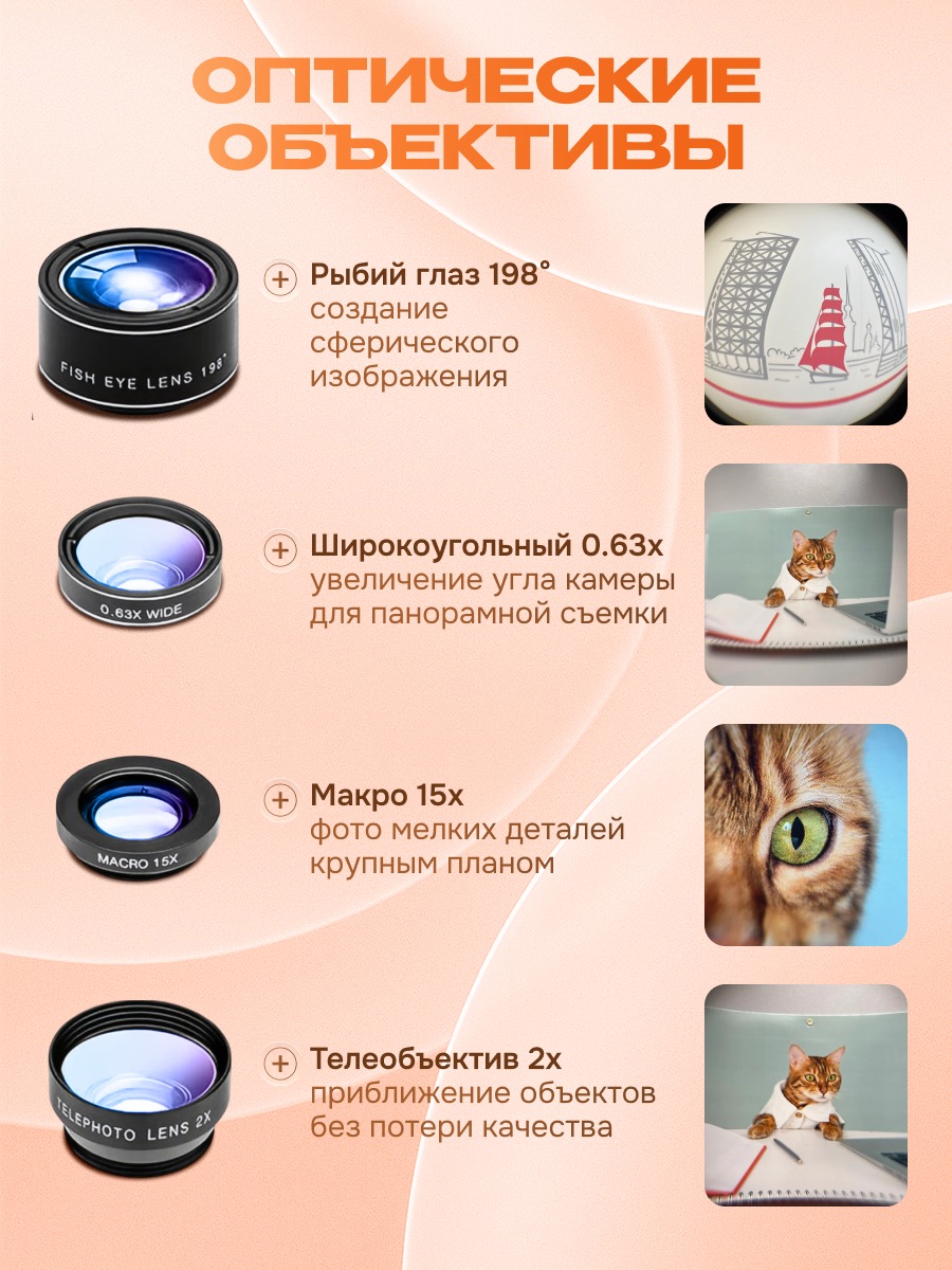 Все элементы устанавливаются на комплектное универсальное крепление; оно уверенно держится на устройствах и не оставляет царапин на корпусе. Линзы сделаны из оптического стекла и имеют многослойное просветляющее покрытие, поэтому объективы и фильтры сохраняют высокую контрастность изображения даже при ярком встречном свете.